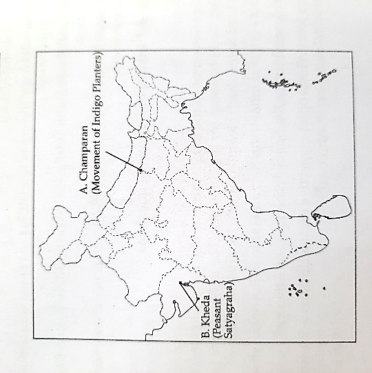 Two places A and B are marked on the given outline map of India. Identify them and write their correct names on the line drawn near them. (A) The place where the Indigo Planter’s movement took place (B) The place where a Peasant Satyagraha was organised
