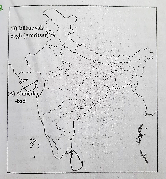 See lessOn the outline map of India. Locate and label the following with suitable symbols. (A) The place associate with the Cotton mill workers Satyagraha. (B) The place where the Congress session took place in 1927.