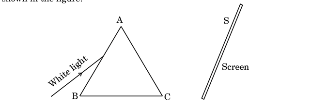 A person allowed a narrow beam of white light from the sun to enter a dark room through a small aperture and placed a glass prism in its path in such a manner that the beam falls on the face AB of the prism as shown in the figure. A screen S is placed on the other side of the prism, facing AC. On turning the prism slowly, a beautiful band of colours is obtained on the screen. It is the spectrum of sunlight. (a) Name the phenomenon due to which a prism splits the incident white light into a band of colours. (b) State the reason of getting a band of seven colours in the above case.