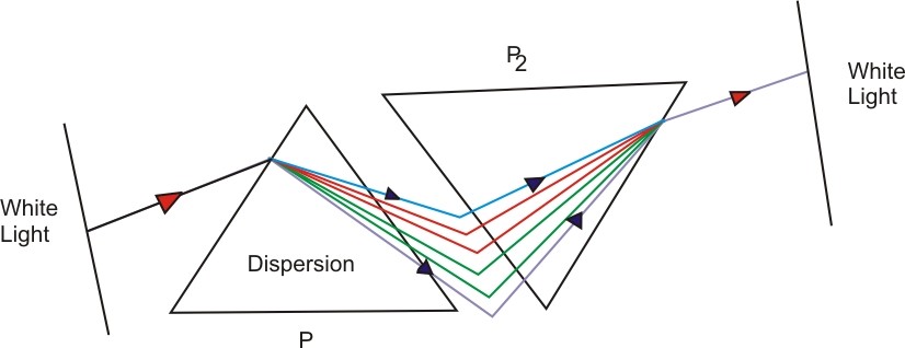(c) To show recombination of spectrum of white light, Newton used two prisms. The first prism disperses white light into seven colours. When this spectrum is passed through a second, inverted prism, it recombines the seven colours back into white light.