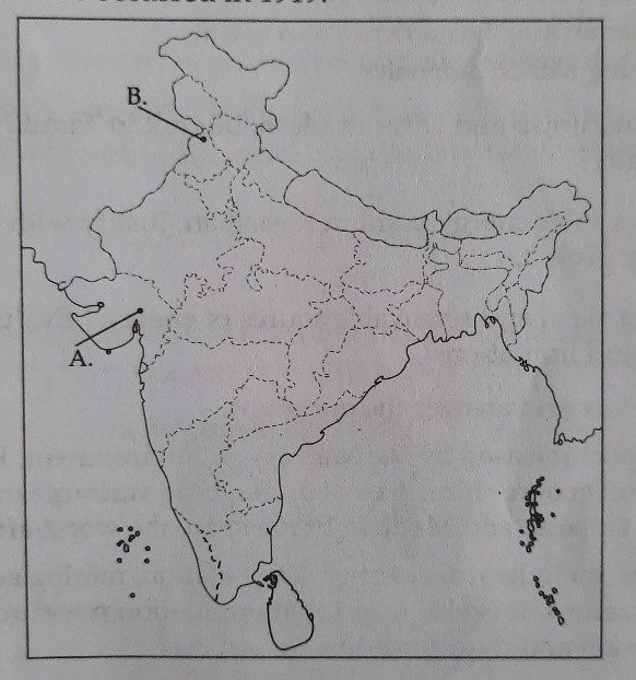 On the political map of India, locate and label the following with a suitable symbol. Identify the places marked on the map. (A) The city associated with the significant strike by mill workers during the freedom struggle. (B) The place where the massacre occurred in 1919.
