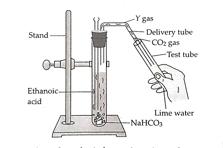 Rakvi performed an activity by taking ethanoic acid and sodium hydrogen carbonate as shown in the diagram given below. The diagram shows an experimental setup where ethanol is oxidised to ethanoic acid using an oxidizing agent, producing CO2 gas sodium bicarbonate (NaHCO3) may be used to test the acidic nature of the product. Answer the following questions based on the given information: (i) What is the observable change when CO2 gas reacts with lime water in the in this experiment? (ii) Rakvi observed that a salt X is formed with the evolution of gas Y. Identify the salt X and evolved gas Y. (iii) Write the chemical equation of the reaction involved.