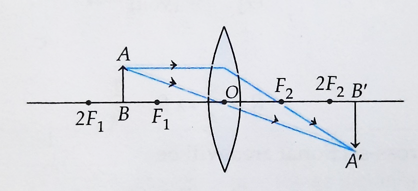 From the ray diagram, the image formed is real, inverted, and diminished because the object is placed beyond 2F₁ of a convex lens.