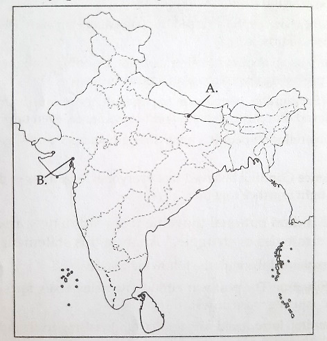 Two places A and B are marked on the given outline map of India. Identify them and write their correct names on the line drawn near them. (A) The place where the Indigo Planter’s movement took place (B) The place where a Peasant Satyagraha was organised