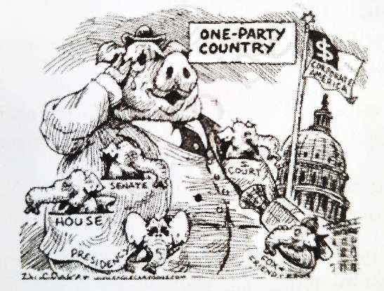 It portrays a pig labeled “One-Party Country,” symbolizing greed and corruption. The cartoonist suggests that corporations control key branches—Senate, Court, House and President—using money power, making democracy look like a monopoly of wealthy elites.